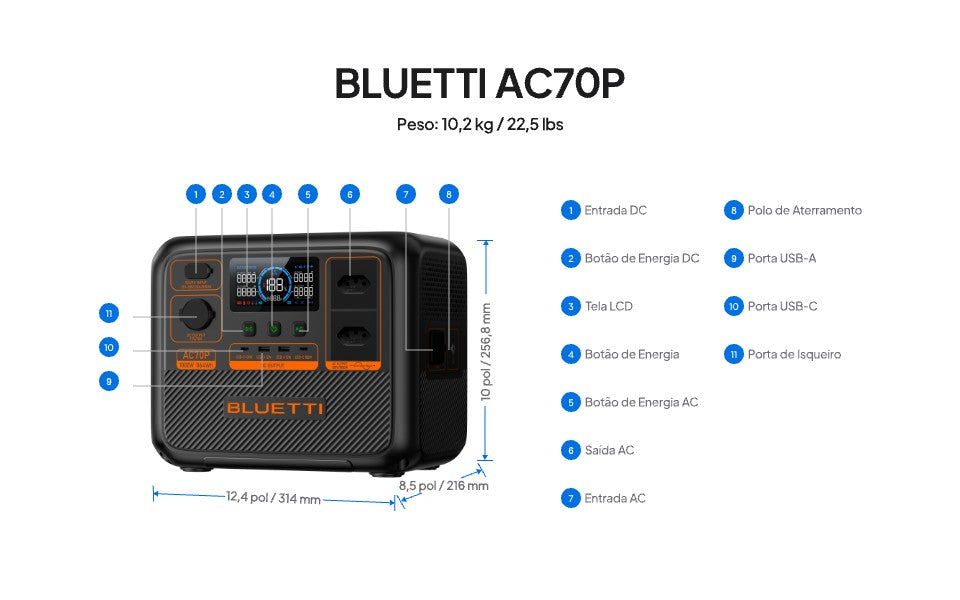 BLUETTI AC70P Estação de Energia Portátil | 1000 W 864 Wh