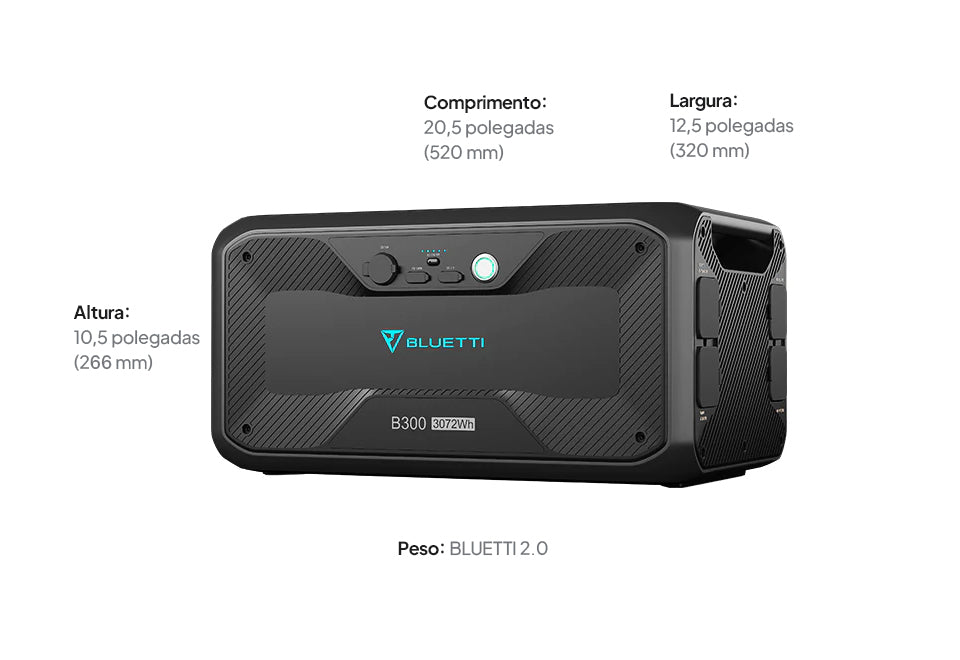 A B300 tem capacidade de 3.072 Wh e mais de 3.500 ciclos de vida com as células de bateria LiFePO₄, oferecendo até 80% da capacidade original. Além disso, duplicará, triplicará e até quadruplicará a capacidade total com as séries BLUETTI AC200MAX, AC200P ou AC300.